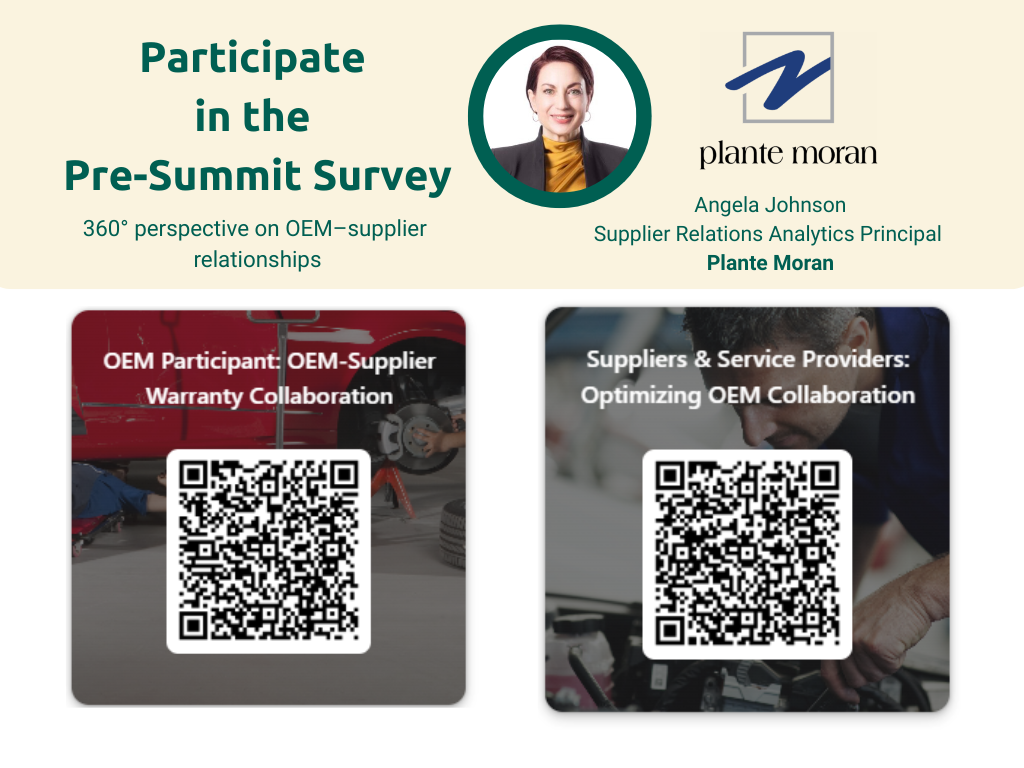 Plante Moran is conducting a pre-conference survey to capture a 360° view of these relationships and how they influence warranty performance. Your input will directly shape the presentation by Angela Johnson, Supplier Relations Analytics Principal, during her session: