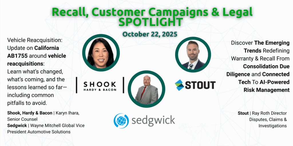 - Vehicle Reacquisition Updates: Get the latest on California AB1755 and its impact on vehicle reacquisition, including what’s changed, what’s on the horizon, and lessons learned so far. Legal experts from Shook, Hardy & Bacon and warranty leaders from Sedgwick will walk through common pitfalls and compliance must-knows.